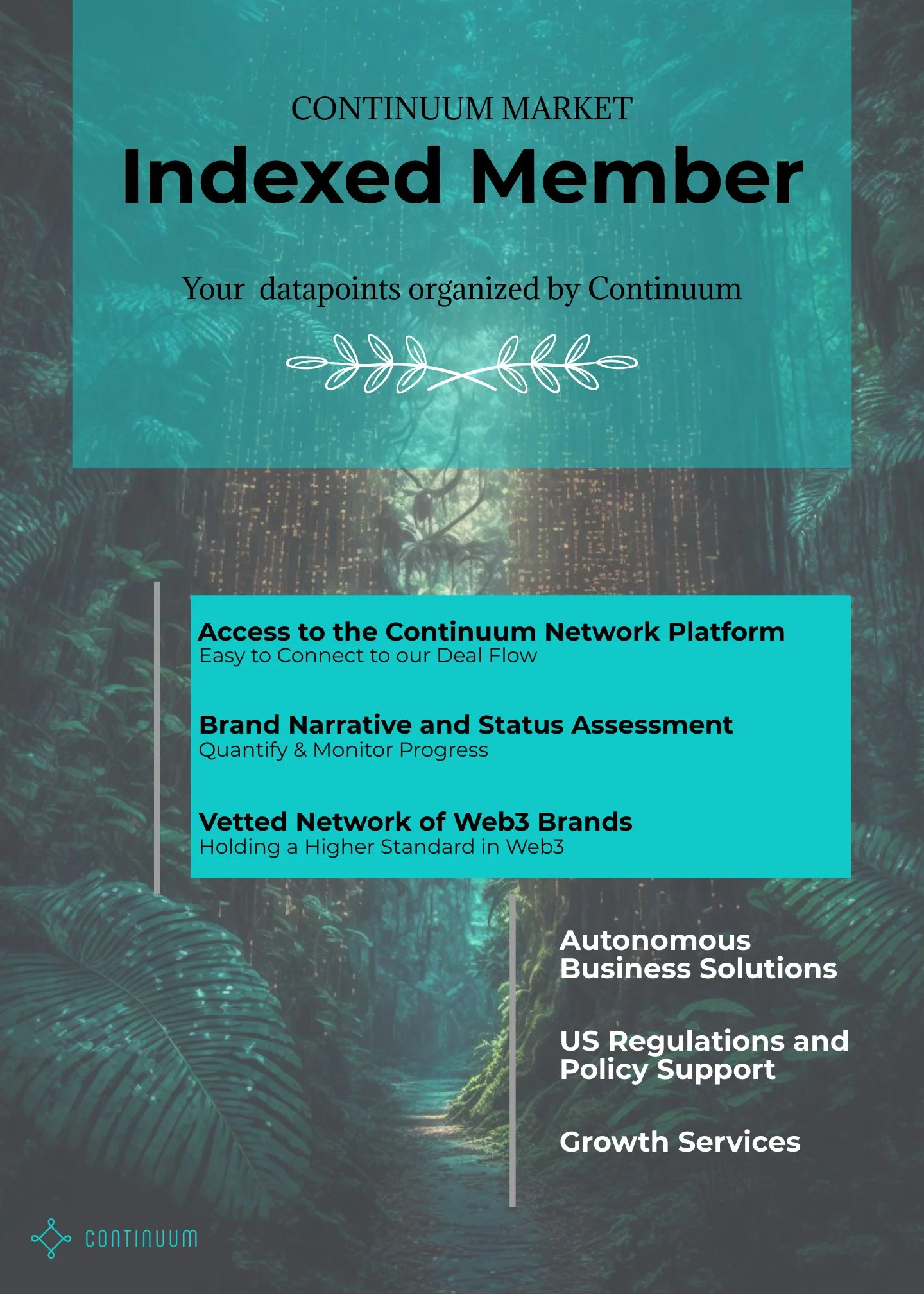 Product, service, event, sponsorship, VC Network, immersive experience, job posting, whitelisting, networking, cross collaboration, partnership, marketing, press, exposure, development, QA testing, cybersecurity audit, data, compliance, government relations opportunity or requests at Continuum Market.